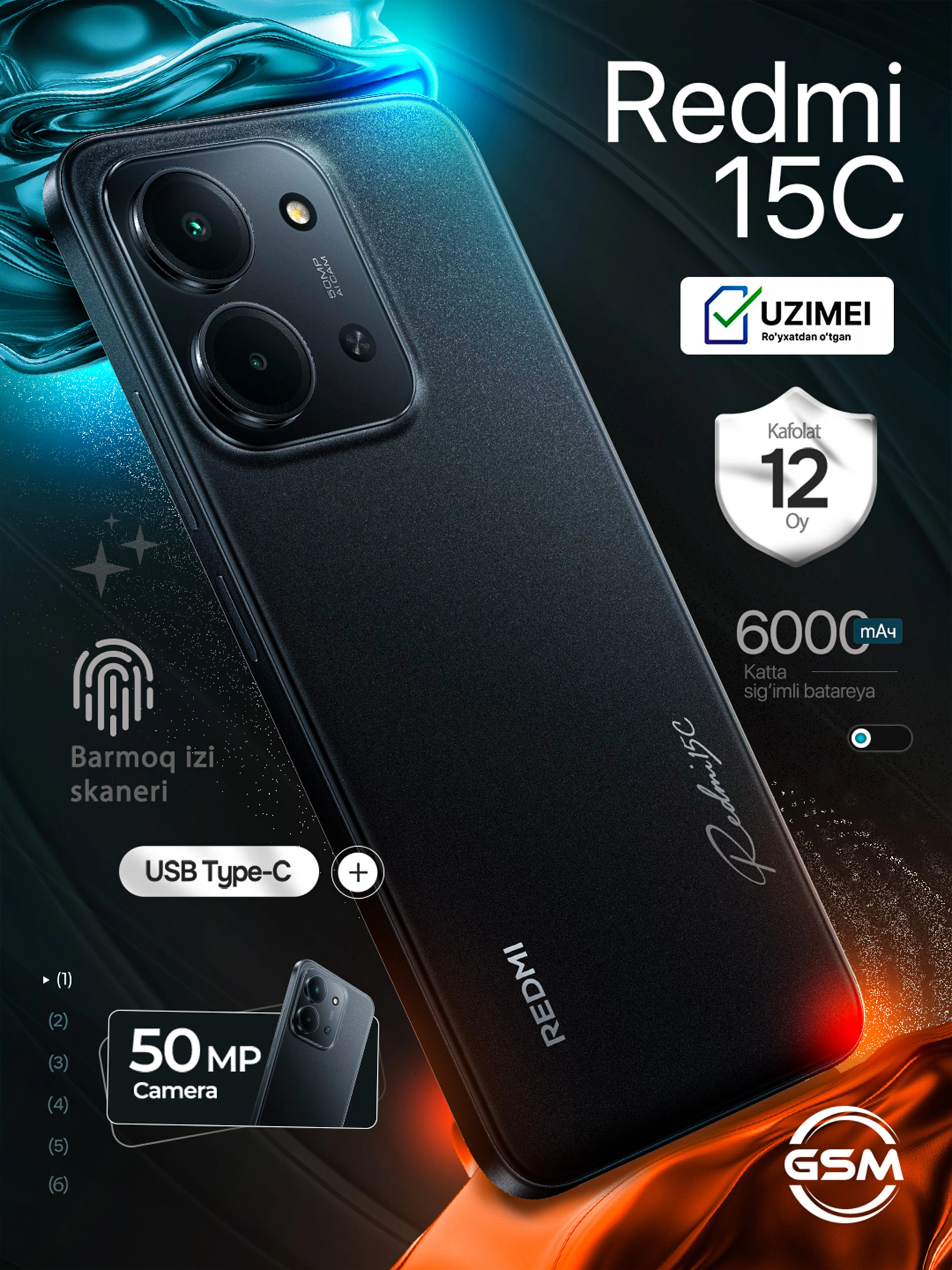 Смартфон Xiaomi Redmi 15C, 6.9" IPS 120 Гц, 50 Мп, батарея 6000 мАч, 33 Вт за 1899000 сум со скидкой 81%. Uzum Market