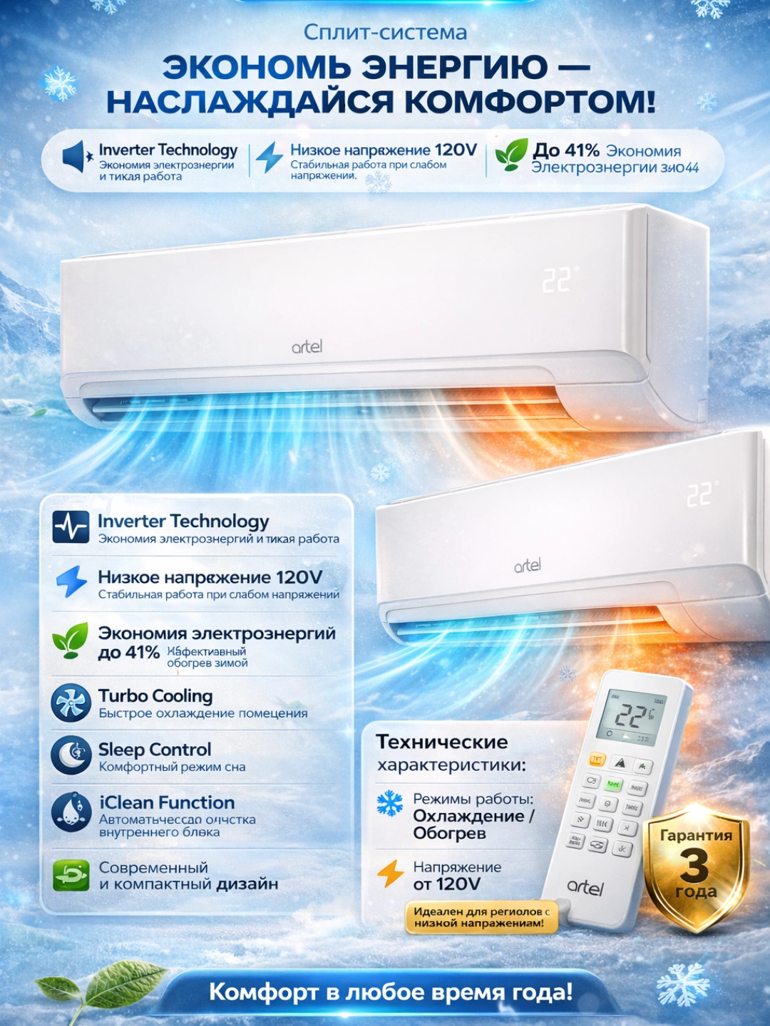 Кондиционер ARTEL ICEBERG 09BE INVERTER за 4653380 сум со скидкой 26%. Uzum Market