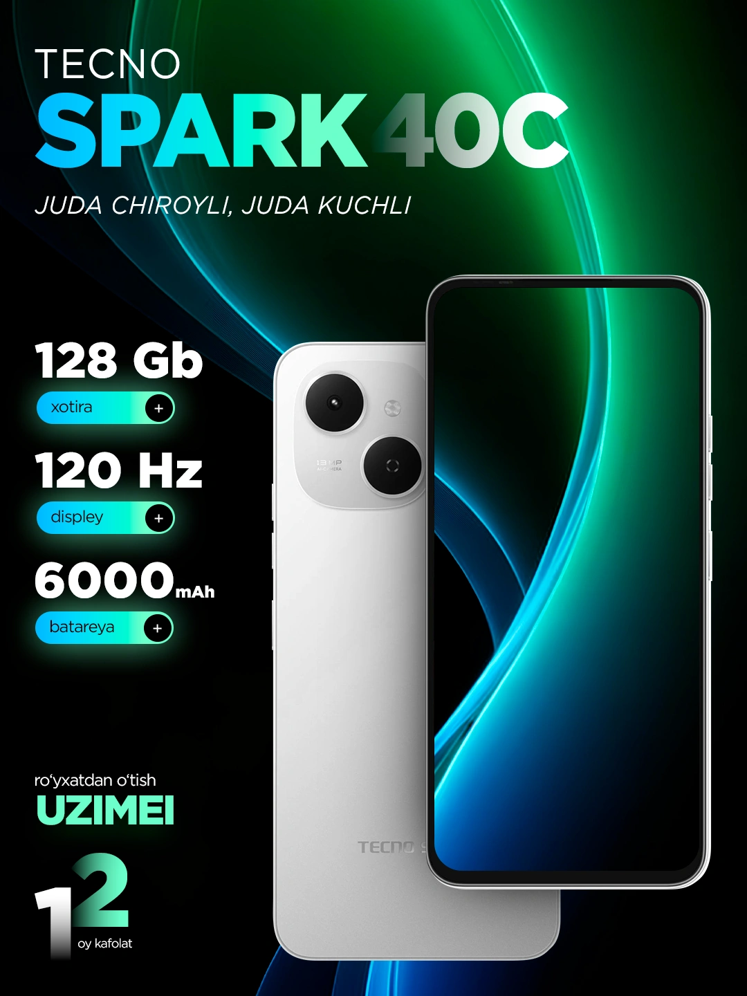 Смартфон Tecno Spark 40C, 6.67" 120Гц, 4/128ГБ, 6000 мА/ч, 13+8МП за 1237740 сум со скидкой 23%. Uzum Market