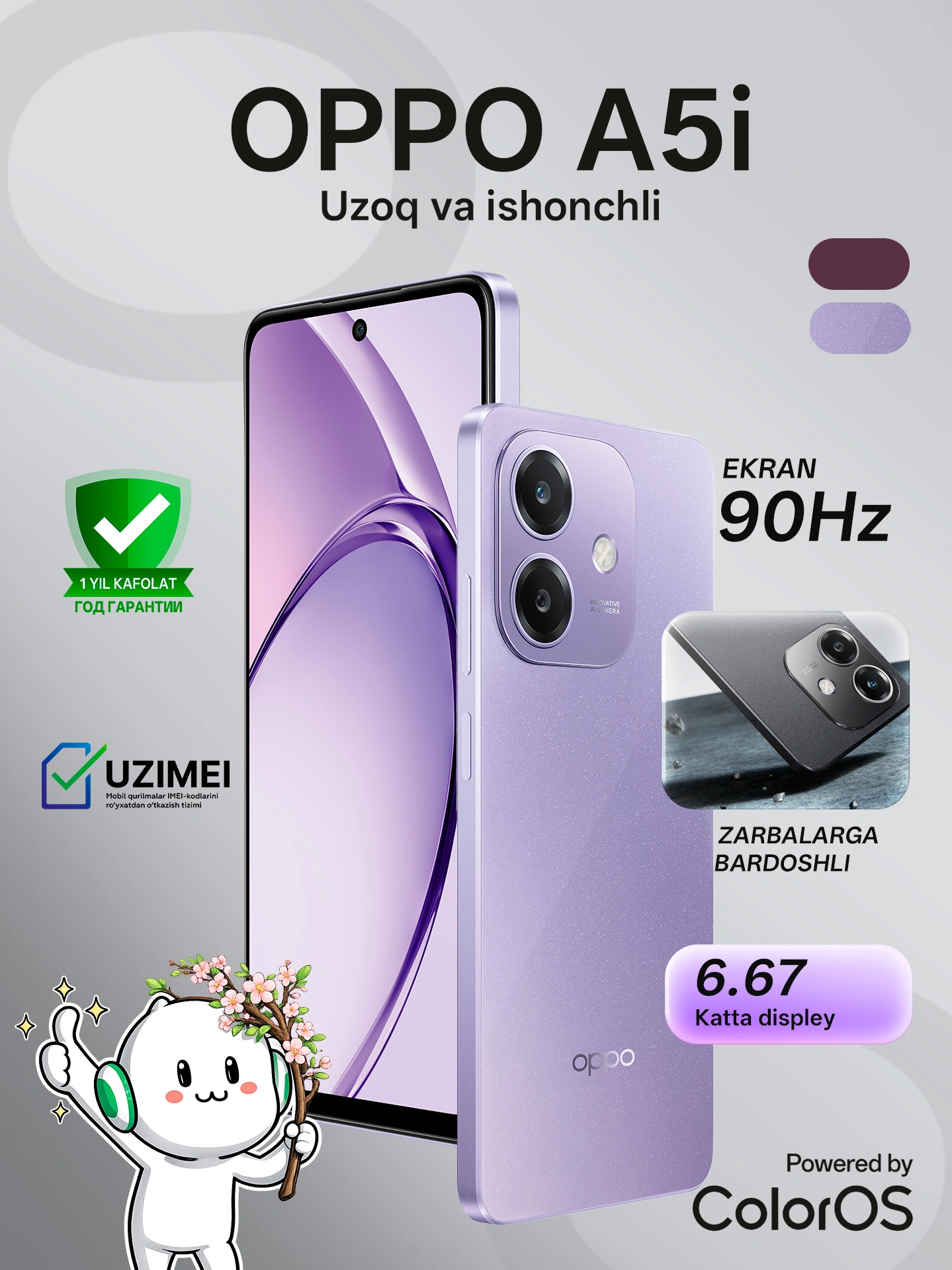 Смартфон OPPO A5i (4+4)GB/64GB, Красный | Фиолетовый, 1 год гарантии + UZIMEI за 1550000 сум со скидкой 18%. Uzum Market