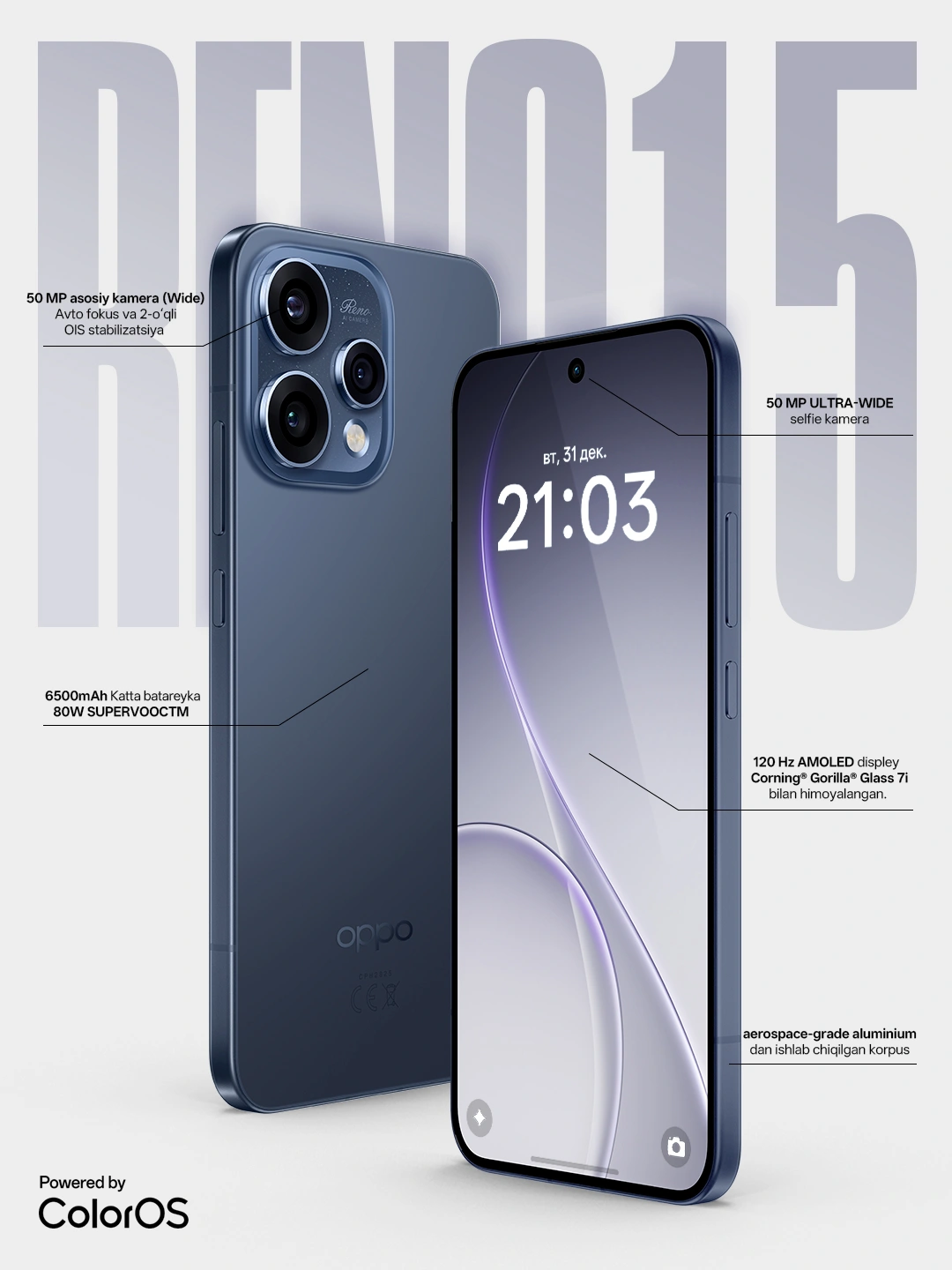 Смартфон OPPO Reno15 5G 12/512GB, Синий Белый, 1 год гарантии за 8700000 сум со скидкой 13%. Uzum Market